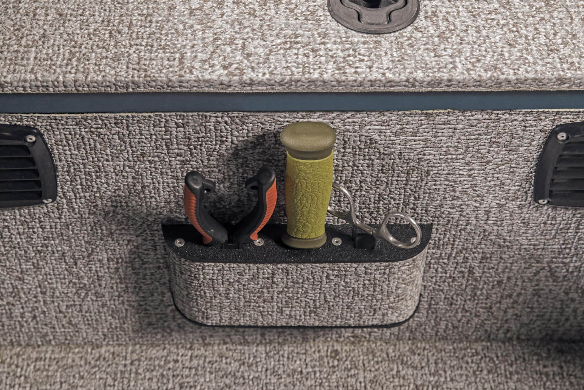 Držák prutů, nerez, na 3 pruty, organizer na nástrahy, kleště a nůž